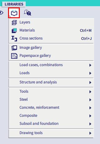 The Libraries menu is important and extensive because it contains the links to all libraries that are linked to SCIA Engineer. When working in a project, then the required library items are always copied to and saved with that project.