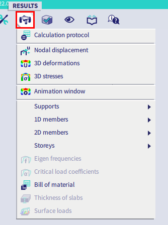 With the Results menu the user can access the (solver) results that are available after the calculation of the structure.
