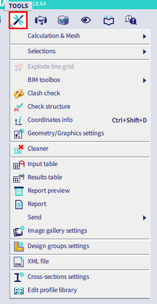 The Tools menu contains a variety of tools, like calculation & mesh, tools for making selections, the BIM toolbox, coordinates info, tools for creating and filling the Engineering report,...