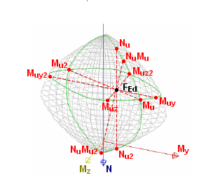 The Capacity - diagram calculates the extreme allowable interaction between the normal force N and bending moments My and Mz. In theory this diagram is a 3D-diagram, but SCIA Engineer allows the user to obtain horizontal and vertical sections. The axis of the diagram has an axis for the normal force N, the bending moment My and the bending moment Mz.