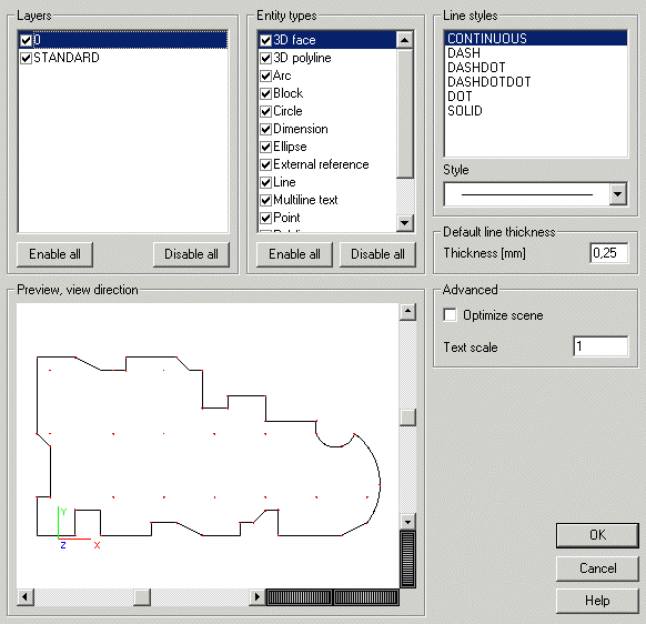 This list box contains the layers that were defined in the original DWG/DXF file. Only selected layers are shown in the preview window of the Import dialogue.