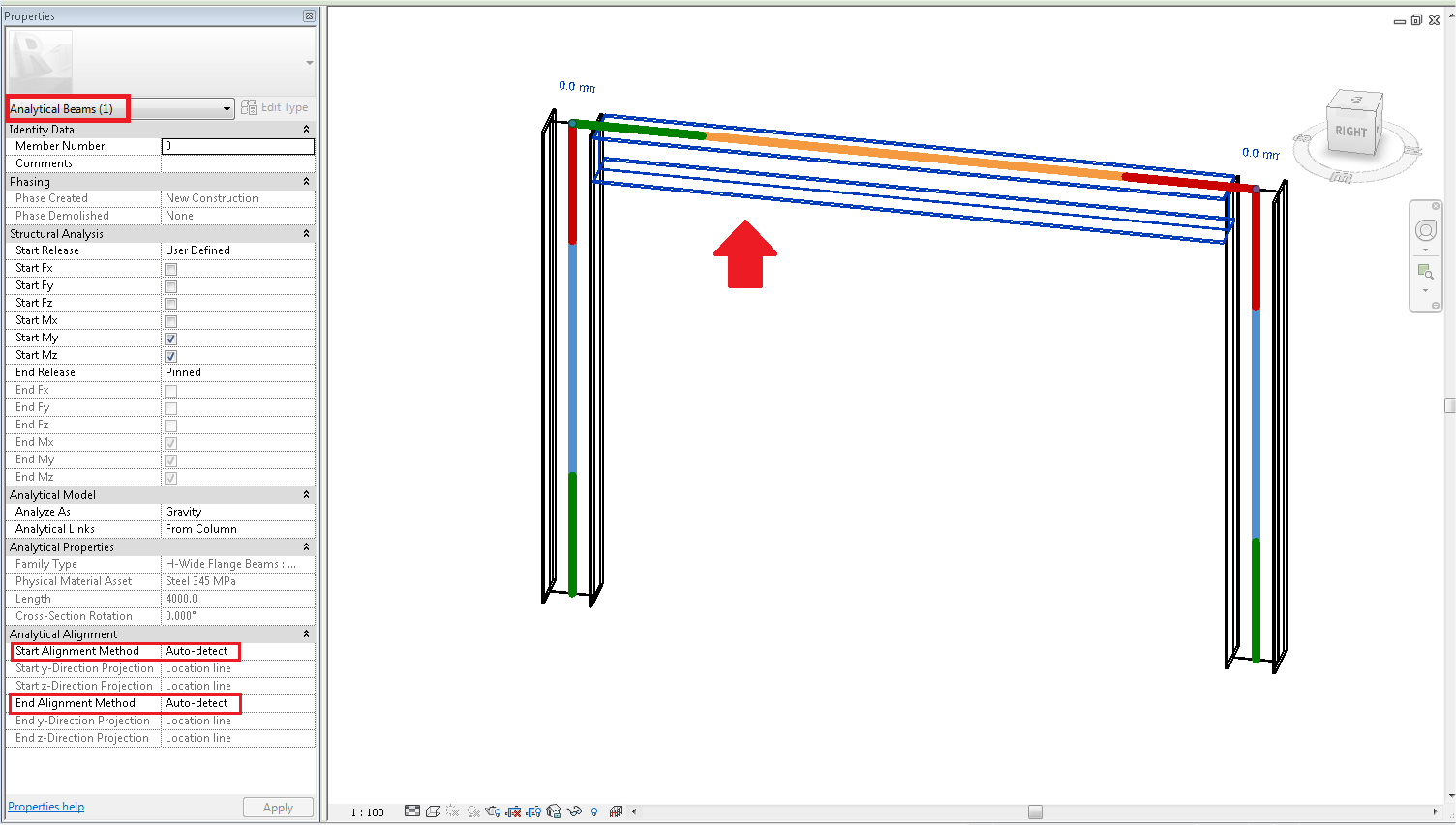 - Start with inputting 2 column (standard Revit families; cross section H-Wide Flange Column: HEA300 and material Steel, 45-345) of 3 meters height at a distance of 4 meters. Then add a beam (same cross-section and material) between the upper ends of the columns.