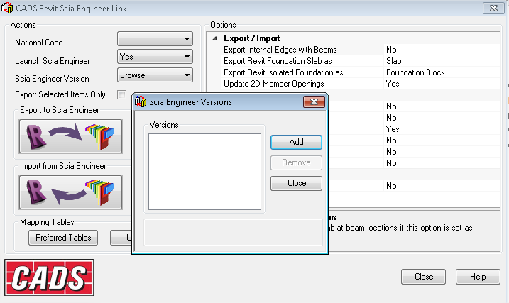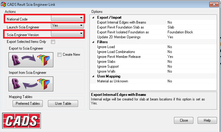 These options give the Revit link the information it needs to execute the transfer. Since this is the first time the Revit link is used, the ‘National Code’ as well as ‘SCIA Engineer Version’ will be blank.