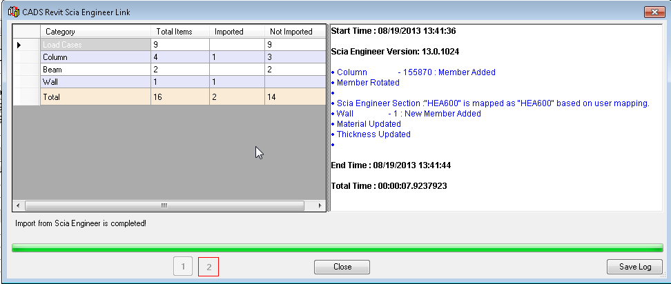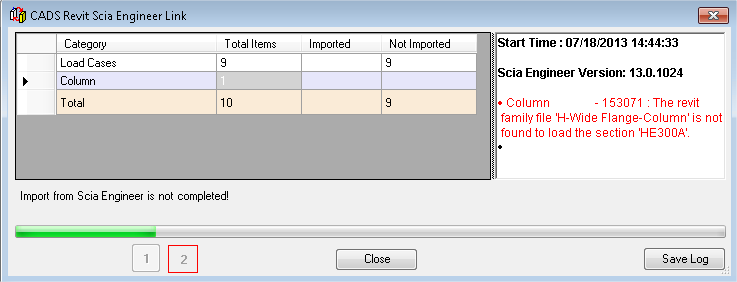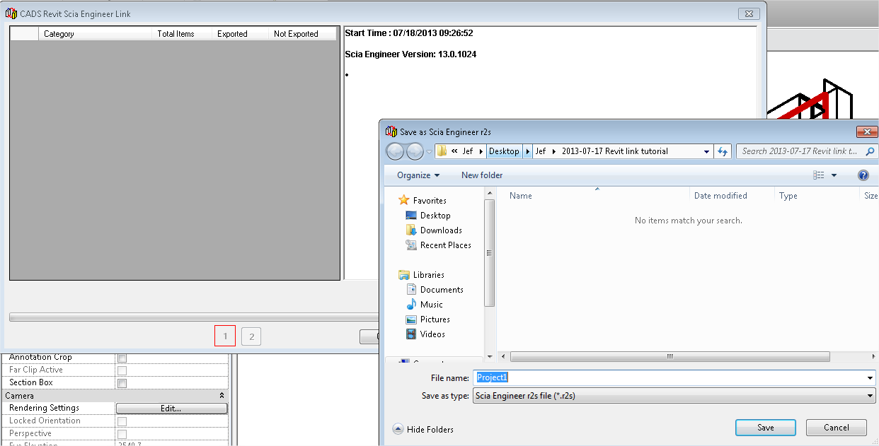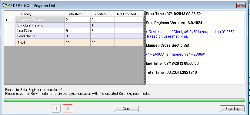 - You will see the ‘CADS Revit SCIA Engineer link’ progress window appear. Here you can see which items (beams, columns, plates, load cases ...) are recognised by the link. It will also ask where to save the .R2S file (which is the file you must import in SCIA Engineer). Save the ‘SCIA Engineer r2s file’ as ‘Project1’ and choose ‘Save’.