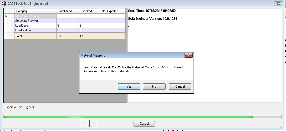 - Once the transfer has started, the link will give a message when it does not recognise a certain item. The link is based on names. In this example, the Revit material ‘Steel, 45-345’ cannot automatically be linked to SCIA Engineer. This link is called ‘mapping’, and must be added manually if the link cannot do the mapping automatically.