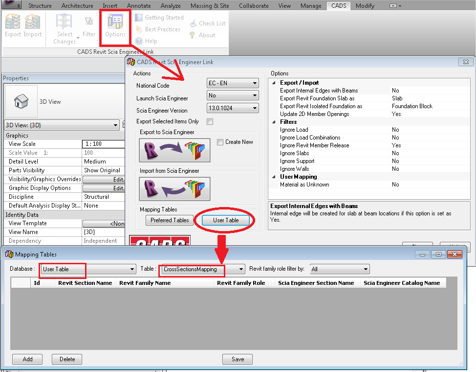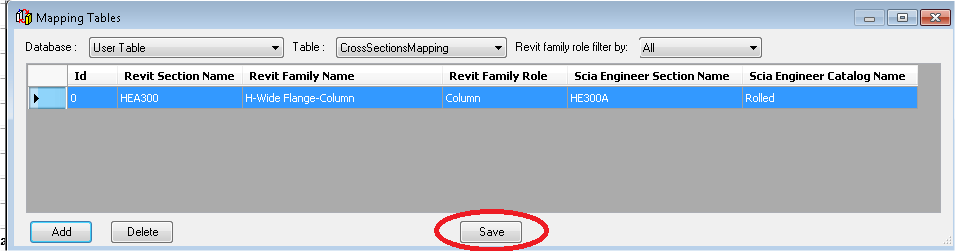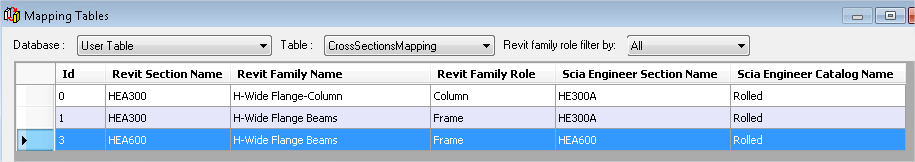 - To add the mapping for this section to the Revit link, first click ‘Close’. Go back to the options of the Revit link, and open the ‘User table’. The user table contains the mapping defined by the user. If you click on ‘User Table’ in the new window, you will see different mappings that are already inserted. Now we want to add mapping for the database ‘user table’ in the table ‘CrossSectionsMapping’.