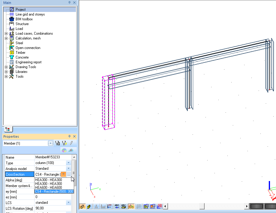 - Now we will change the project in SCIA Engineer, and then export it back toSCIA Engineer. Copy 1 beam and 1 column, and change 1 cross-section to HEA600.