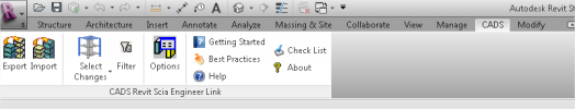 - Before you are going to export the Revit project to SCIA Engineer, you must save the project first. Then choose the ‘export’ option. Note that the ‘Export’ button under the tab ‘CADS’, or the ‘Export to SCIA Engineer’ button in the options of the tab ‘CADS’ do the exact same thing: create an .R2S file that can be imported in SCIA Engineer.