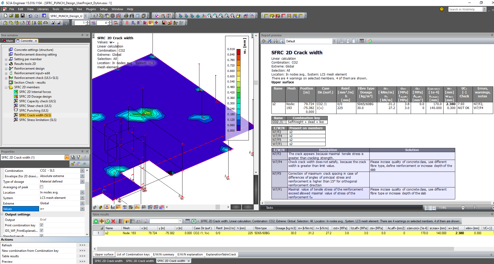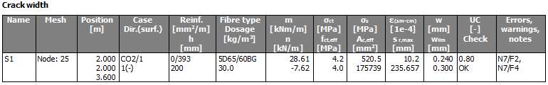 | w+ | Calculated crack width for upper fibres |