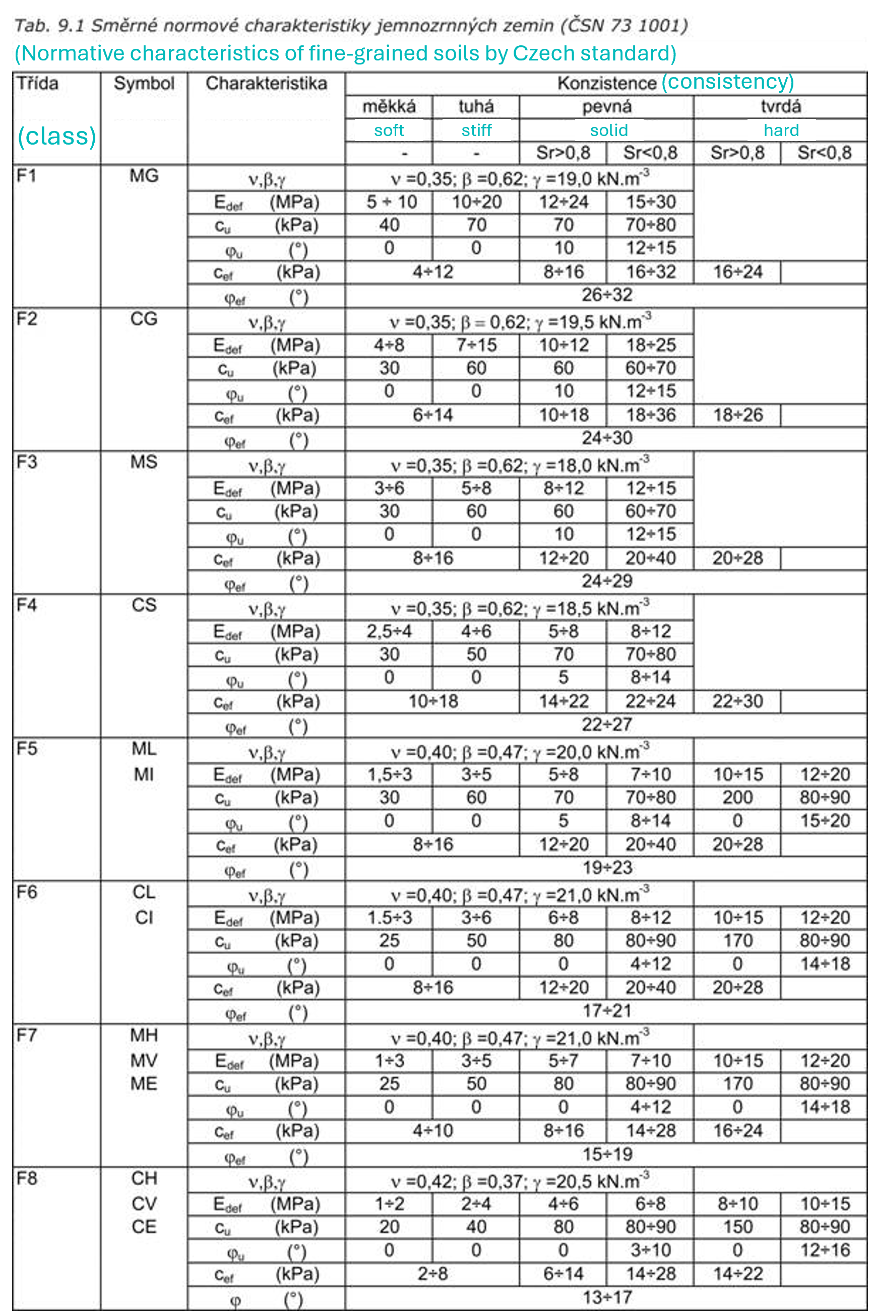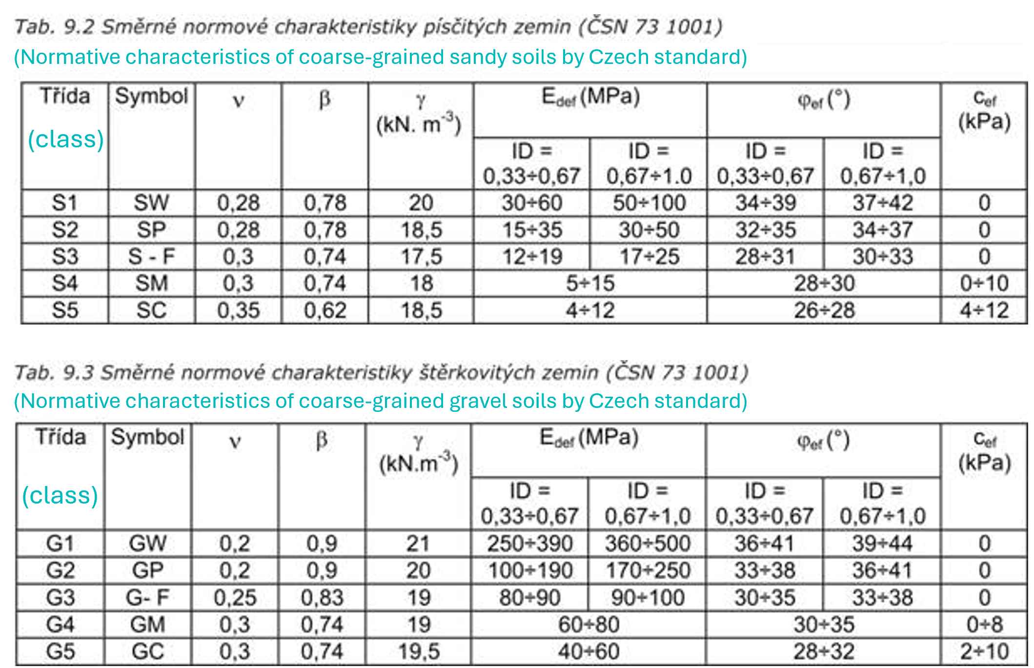 In case of Czech standard, Edef and Poisson's ratio might be estimated based on the following tables (see also soil types according to CSN in this chapter):