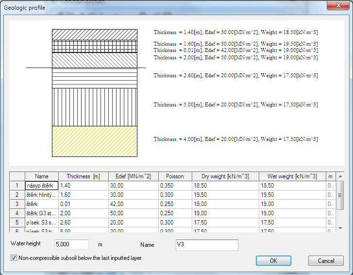The checkbox “Non-compressible …” can be used if the soil below the last layer is non-compressible. The system applies coefficient of depth reduction ϰ2 in this case (calculation of ϰ 2 can be found in ČSN 73 1001, art. 80). This option is recommended when the non-compressible layer is placed in a small depth under the borehole.