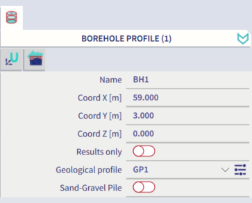 The borehole is defined by the geologic profile and the inserting point in the 3D window. The properties contain only name, its coordinates, the borehole profile and the checkbox Results only.