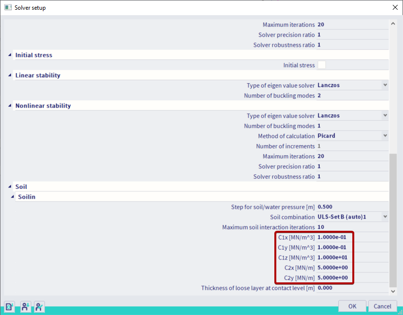 First, I use type Soil-in but I want to have different friction in different parts of the structure. Therefore, the solver setup dialogue is not enough for me, because is just one value can be adjusted there for the friction. Therefore, I can use type Both and thus I am able to define several subsoils with non-zero constants C1x and C1y with all other parameters adjusted to zero. When the Soil-in module runs, the non-zero constants C1x and C1y are of higher priority than those determined by the solver and are applied. Other "zero" values indicate that the values determined by the solver are applied.