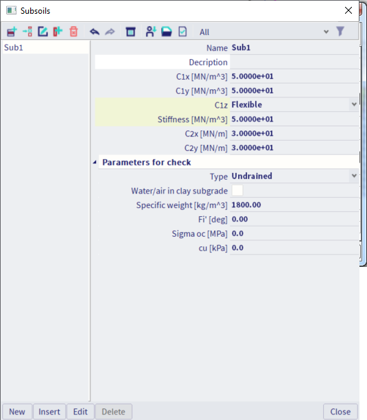 The only type which doesn’t use the data from the Subsoil library. All initial values of C parameters are defined by the Solver setup. C1x and C1y are taken from this setup as the results and the rest is calculated by the Soil-in.