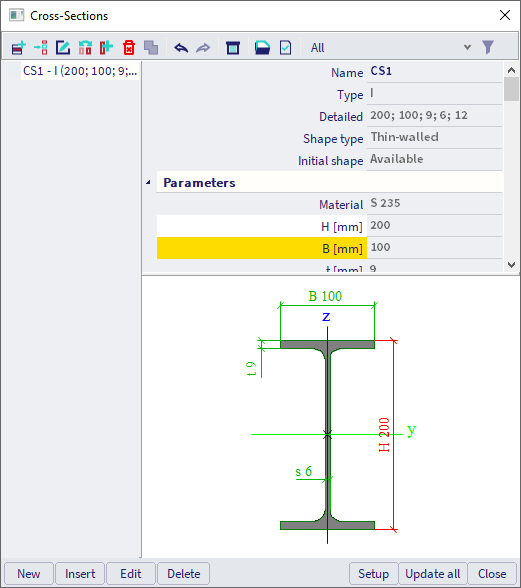 As an example we may give the dialogue for editing of a cross-section. Here, the dimensions of a cross-section represent exactly what this feature is ideal for. On clicking any of dimension lines in the drawing, the corresponding table row is highlighted, and vice versa.
