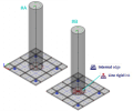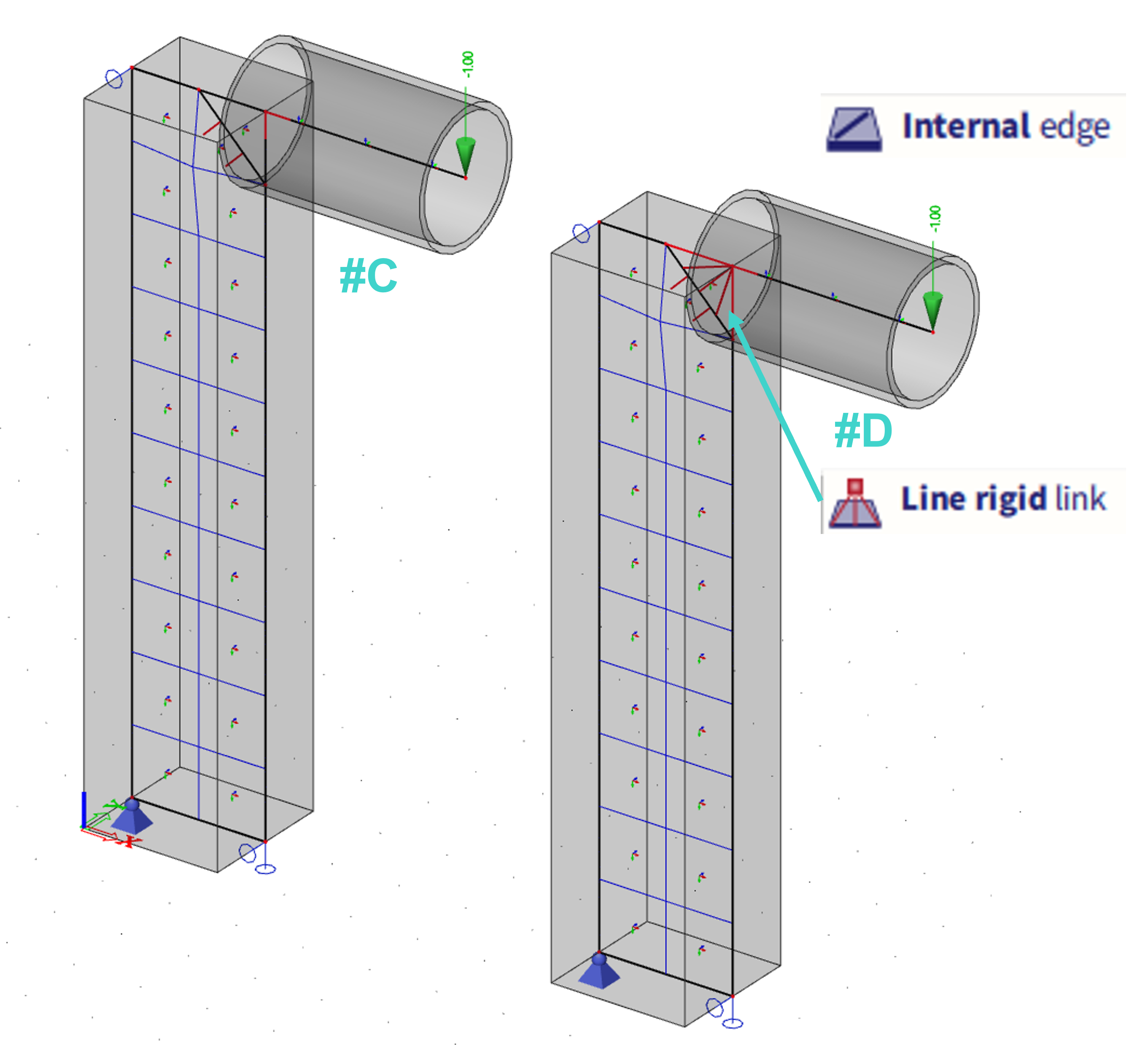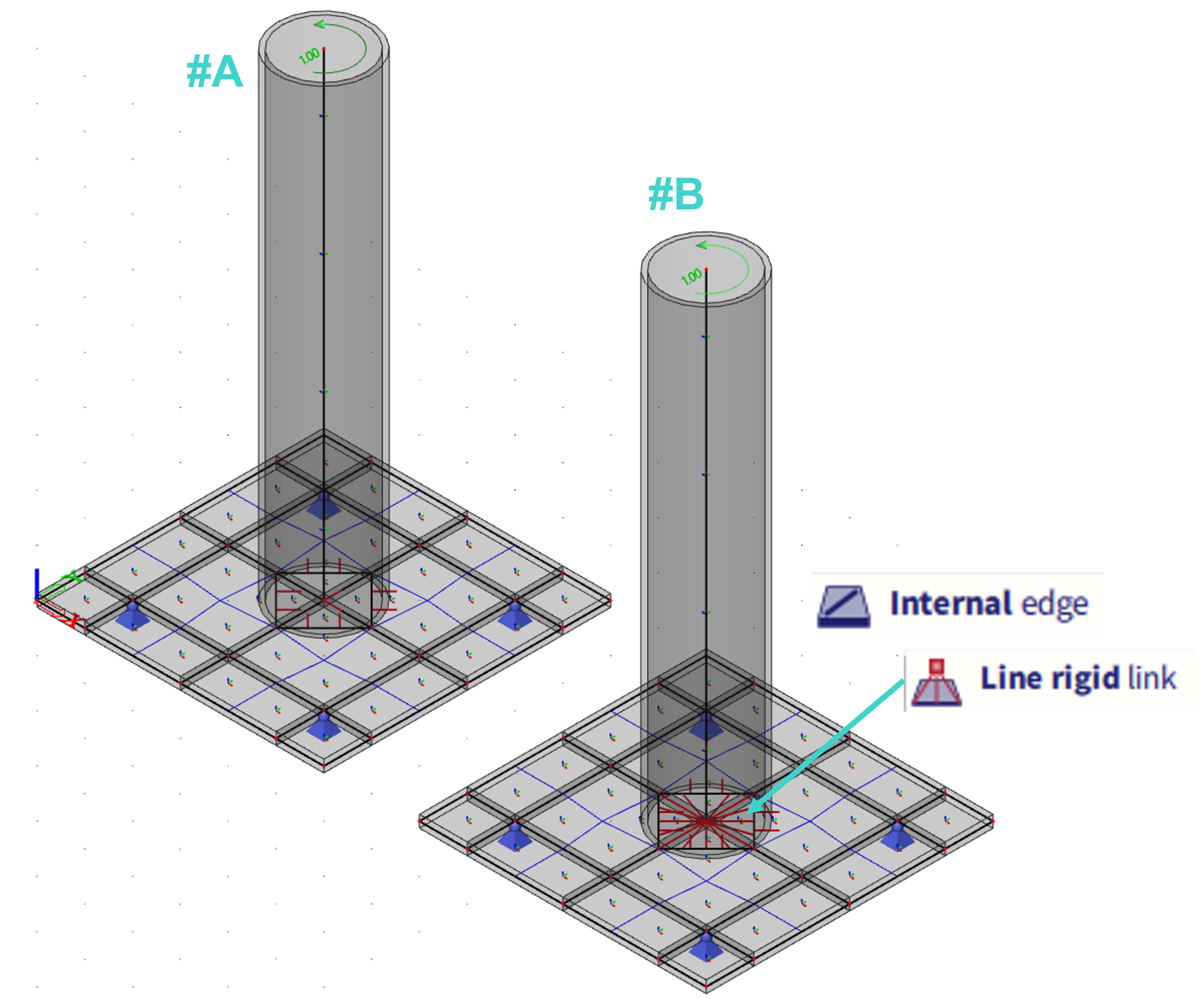 2D structural finite elements (FE)utilized by SCIA solver have practically no stiffness (very little for numerical stability) in rotation along normal (local z axis of these FE). If 1D member is connected to 2D element in a single point, the area to transfer rotation along 2D FE normal is infinitely small, and causes singularities. This solution is not correct, as shown on the examples below. It is up to the user to define the region in which these rotations will be transferred, based on the specific task what is being modelled and corresponding engineering assumptions. This must be always handled by the user and no universal approach (automation by SCIA) is feasible, due to very specific nature of each of these cases. Users are recommended to use rigid links or line rigid arms in order to model these regions properly.