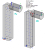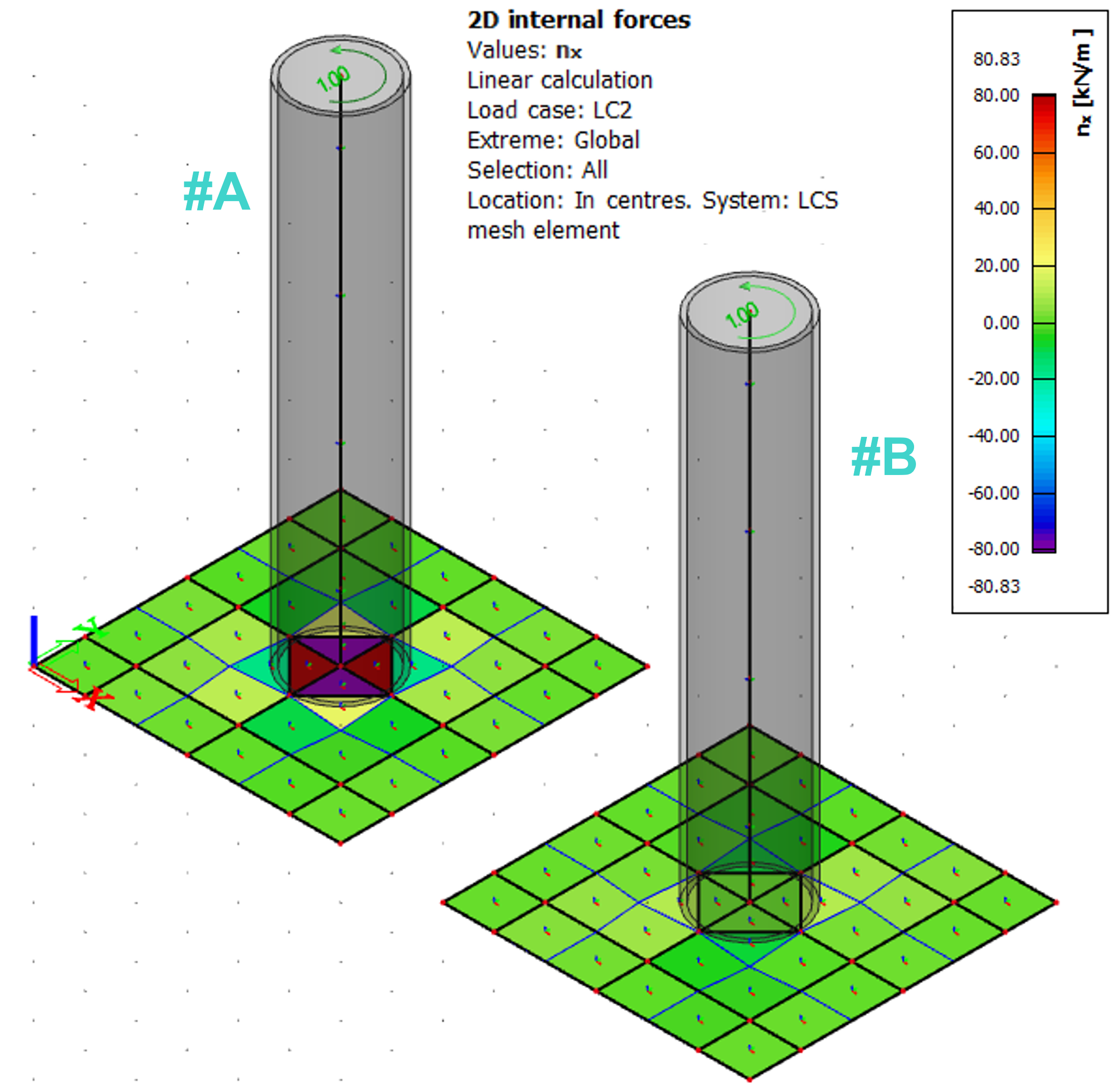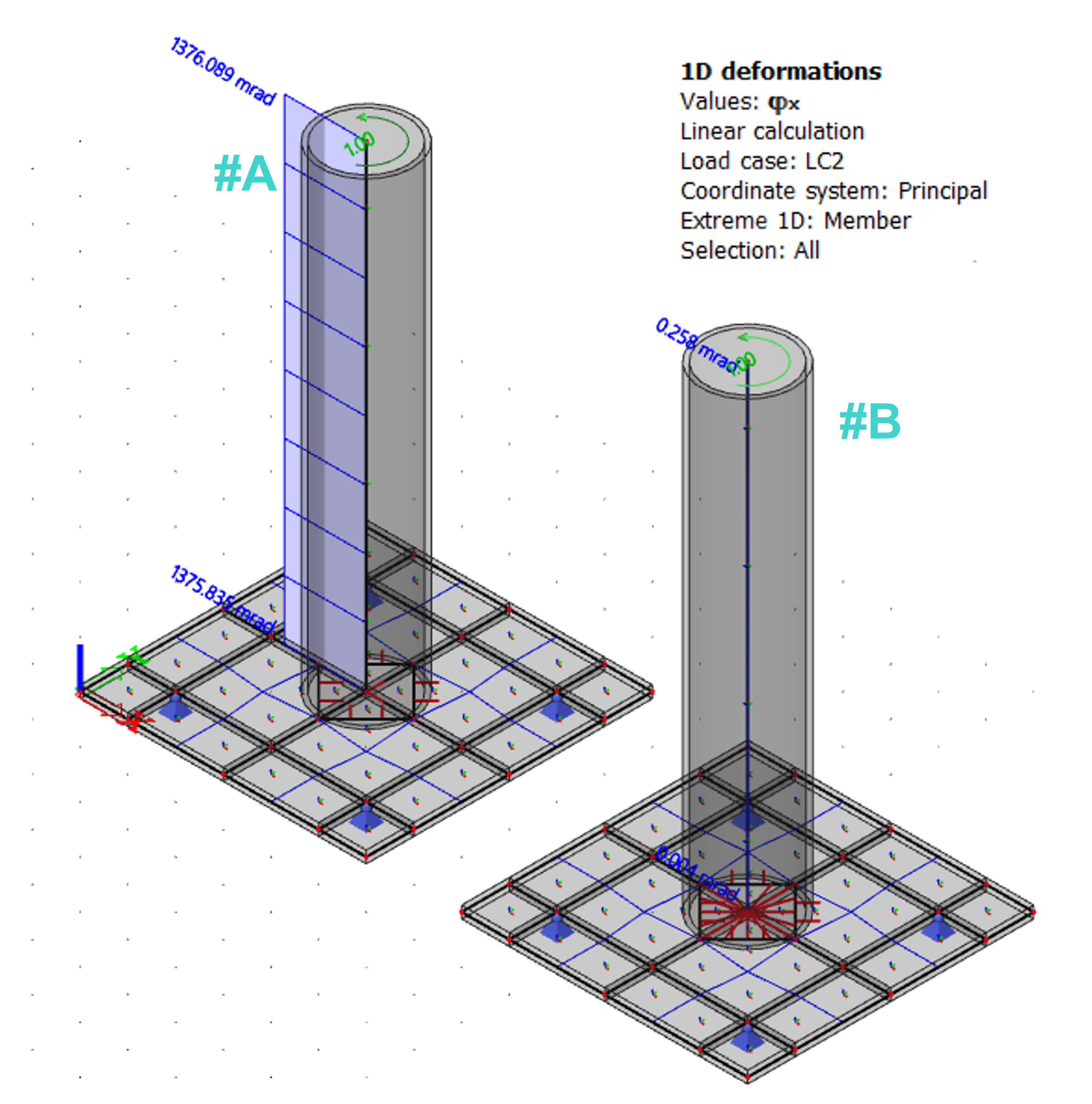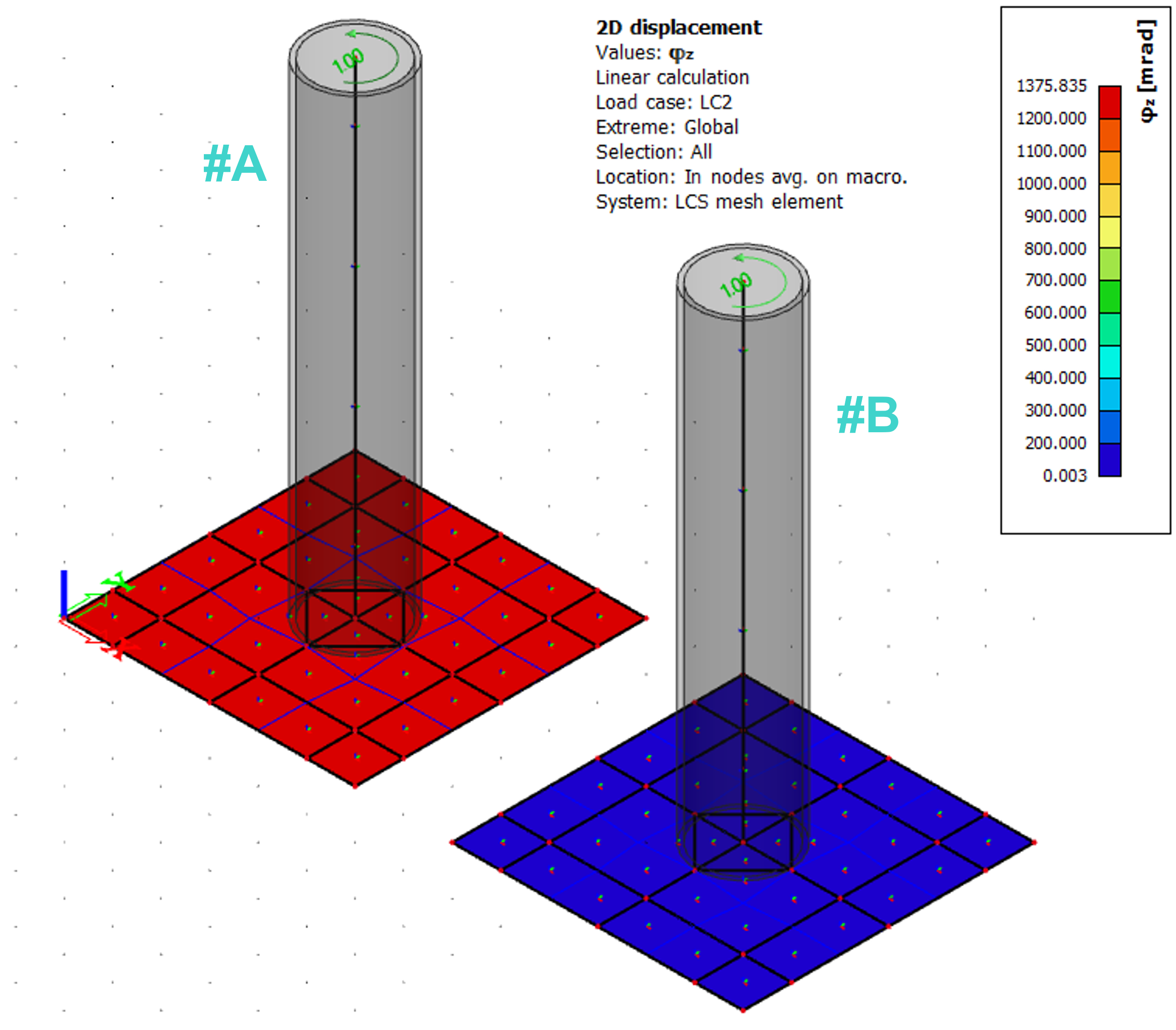 Finite element models differ in defined line rigid arm in case of the model #B. Both are loaded by a torsional moment of 1 kNm applied at the top of the column.