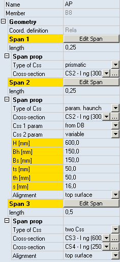 Note: When spans are defined in absolute coordinates, one must be careful to "cover" the whole length of the 1D member. Otherwise, the "span-profiles" cover only part of the original length of the 1D member. Or, if the sum of the spans exceeds the length of the 1D member, spans overlapping the original length of the 1D member are ignored, in other words, the arbitrary beam is simply cut at the length of the original 1D member.
