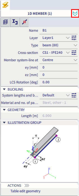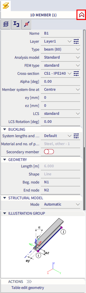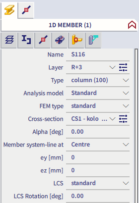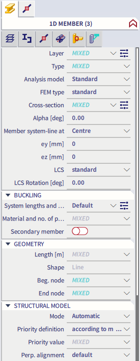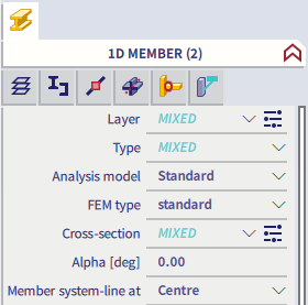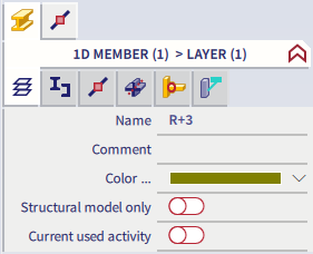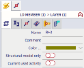 When no icon from the second row is selected, the general properties of the selected icon from the first row are shown and can be modified (left image below). When an icon from the second row is selected, the properties of the related item are shown and can be modified (right image below, the related item Layers of the main item 1D member is selected). Note that in that case changes can have an effect on other (non-selected) items as well, in case that the related item is assigned to other items.