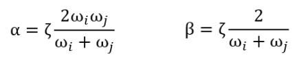 The Rayleigh damping coefficients α and β can be determined based on two damping ratios ζi and ζj for the i-th and j-th mode ωi and ωj. In SCIA Engineer it is assumed, that both of these modes have the same damping ratio ζ, hence the α and β are obtained from the equations:
