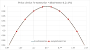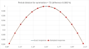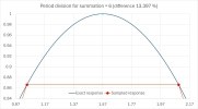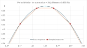 As already mentioned, the period division for summation affects the accuracy of the results, as it may not correctly capture the peak of the response. Based on the known shape of the response, which follows a sine (or cosine) function, and the number of divisions, we can estimate the maximum possible error in identifying the true peak. The maximum error occurs when the period is divided in such a way that the two sampling points used for the response calculation are symmetrically located around the actual peak of the sine (or cosine) function.
