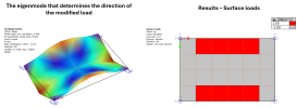 For 2D elements, the setting of the load case is identical to the 1D elements (see example above). However, there is a difference in the calculation of the length of the generated load in areas where the sign of the eigenmode changes from positive to negative (or vice versa). In the case of a 1D element, the length of the positive and negative parts of the element is calculated (so one element may contain a positive force value at the beginning and a negative force value at the end. For 2D elements this calculation is not performed and each element has only one sign (the force has either a positive or negative direction). Hence, the accuracy of the load modification depends on the element mesh setup (the smaller the elements, the more accurate the load created). If the element has a zero value for the deflection of its own shape, the modified load has the same sign as the original ( applied) load.