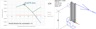 Let's define 3 harmonic load cases LC2, LC3 and LC4, each with the same frequency of 78 Hz (which is close to the natural frequency, so the results are nicely visible), and with property "period division for summation" equal to 360, 48 and 6 respectively, as depicted in the figure below.