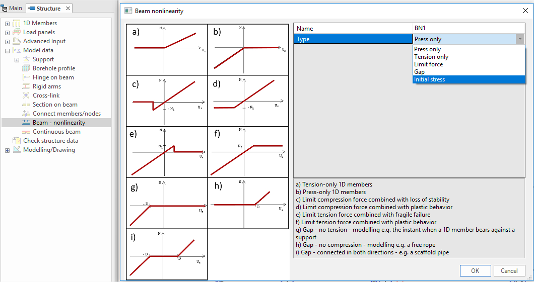 In 'Beam - nonlinearity' dialog there are five possibilities which can be set on 1D member. For information there is a graph of nonlinear behaviour and some tooltip. After applying on 1D member - special symbol will appear on it.