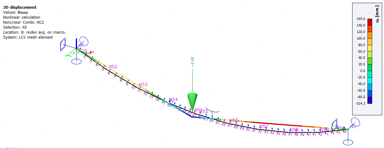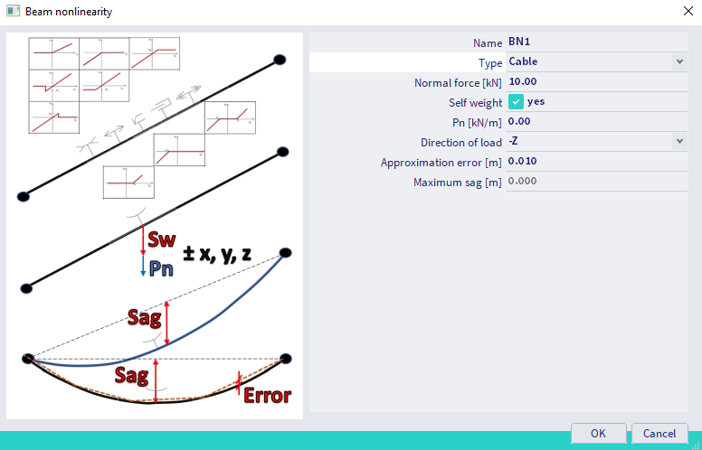 Cable is a special type of beam local nonlinearity, which can be applied on 1D member in model. Cable members possess only axial stiffness (in tension only), the bending stiffness is zero (resulting in 0 values of internal forces Mx, My, Mz, Vy, Vz). In order to implement this feature, a geometrically nonlinear analysis (3rd order, Newton-Raphson) needs to be calculated, therefore it is necessary to perform the" Nonlinear calculation".