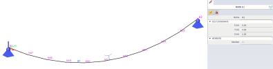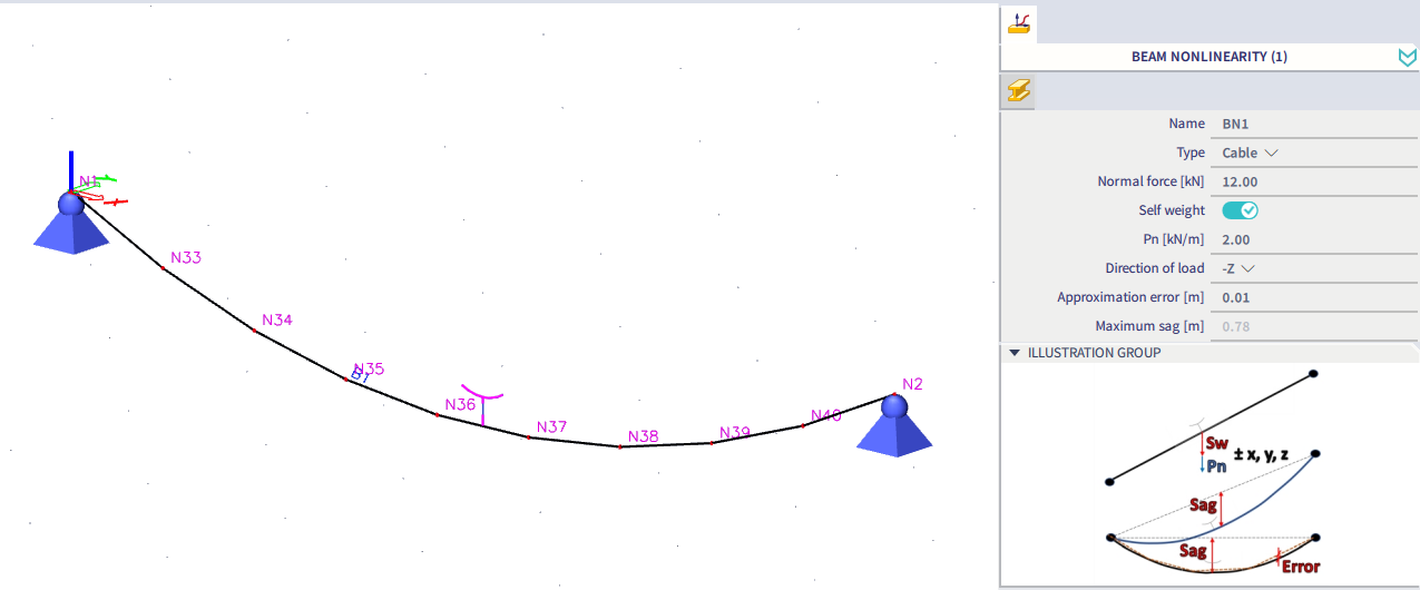 When attributed to a certain 1D member, the shape of that member changes from straight line to a catenary curve (more precisely a linear approximation of a catenary curve). Such 1D member is also marked by a flag with a symbol of catenary curve.
