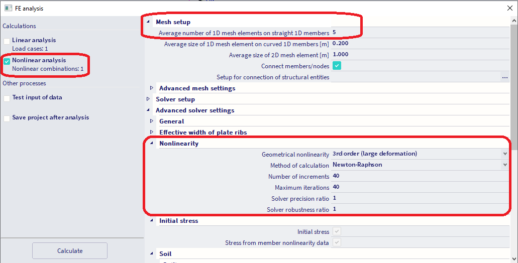 A nonlinear combination needs to be defined, and the geometrically nonlinear analysis calculated. Large deformations needs to be considered (3rd order), along with the Newton-Raphson method of calculation (to be defined in the solver setup). If there are problems with convergence, increase the values of Number of increments, or Maximum iterations.