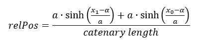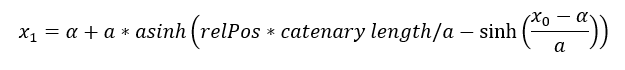 Where a is the curve parameter, x1 is the x coordinate of the given node, x0 is the x coordinate of the catenary head node and α is the shift of the curve in x-axis direction. Thex1 is then derived as: