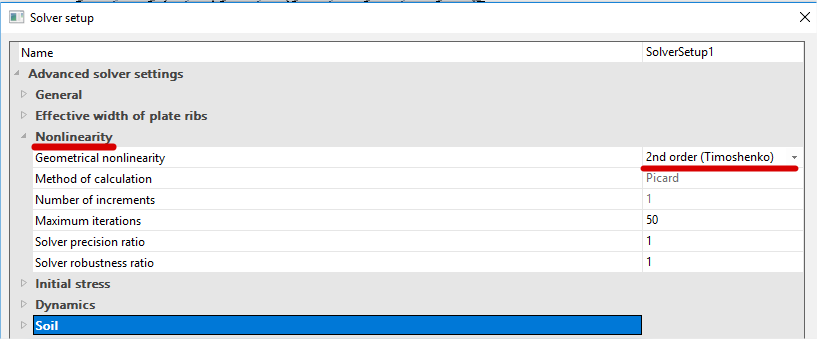 In case however the structure is slender (critical load factor below 3) or the normal force does not remain constant during the analysis (due to advanced non-linearities like non-linear hinges, friction supports, ...) this simplified 2-step approach is no longer valid and a general 3rd order method should be used instead.