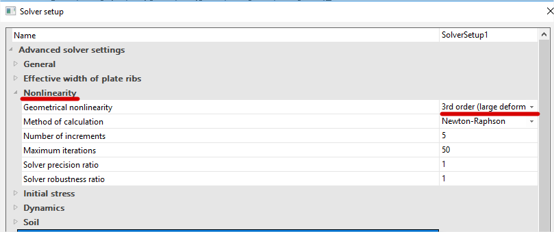 It is called “large deformations” which is based on the Newton-Raphson method for the solution of non-linear equations. This method is a more general applicable method which is very solid for most types of problems. It can be used for very large deformations and rotations; however, is also suitable for small displacements and small strains. Mathematically, the method is based on a step-by-step augmentation of the load. This type iterative solution is suitable mostly for models with membranes and cables like for example bridges.