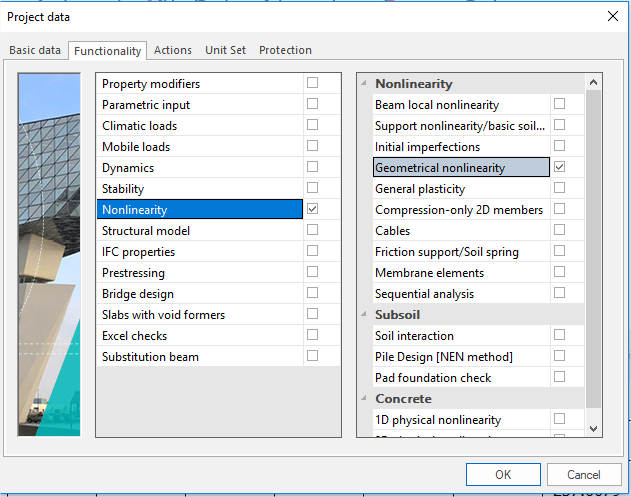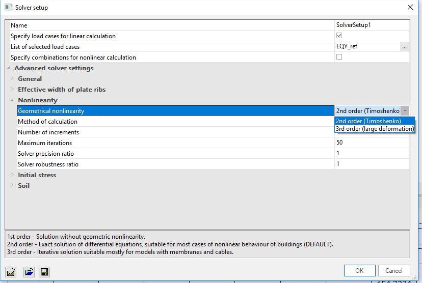 The geometrically nonlinear analysis respects the conditions of equilibrium on a deformed structure. The SCIA Engineer program makes it possible to choose from 2nd order and 3rd order. Both variants represent an algorithm that is implemented in SCIA Engineer as a part of the standard FEM solver.