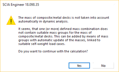 When running a dynamic analysis of a composite structure, SCIA Engineer checks the consistency of mass groups. In case some inconsistency is detected, a warning message is displayed. It is possible to ignore it (for special cases, when, for instance, masses are defined entirely manually).