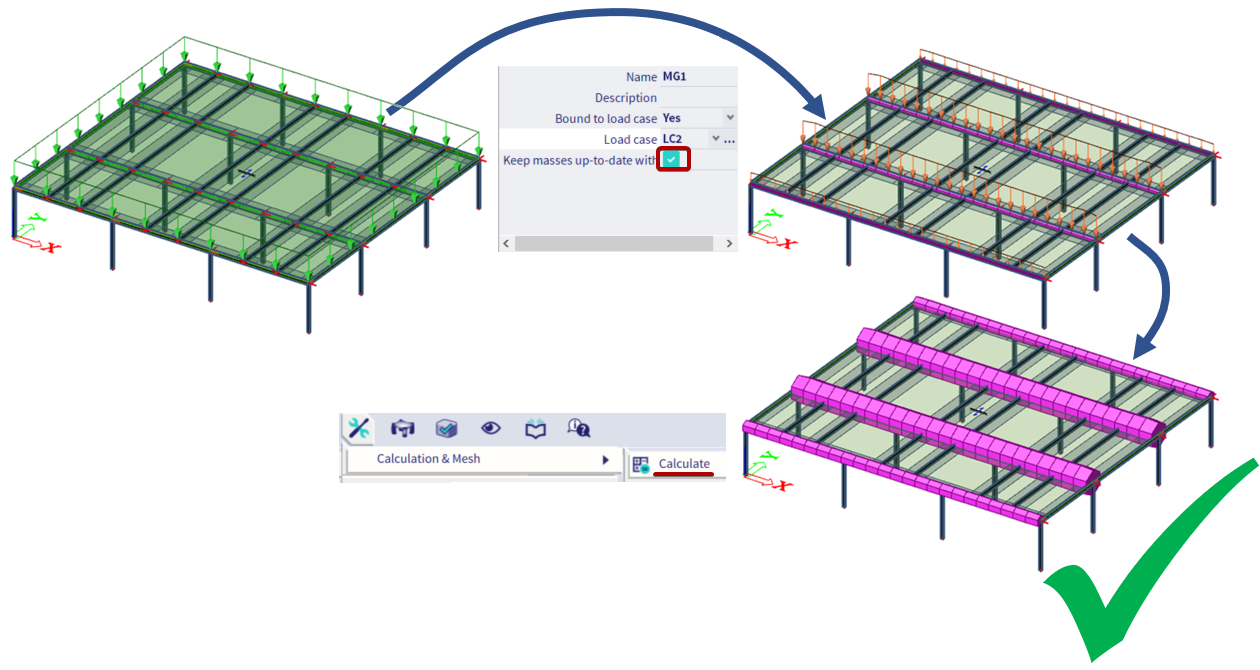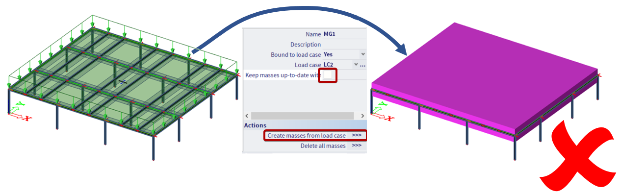 Enabling the Keep masses up-to-datesetting causes the loads to be converted to masses after being distributed to the supporting members of the diaphragm (or load panel). Typically, line loads on beams are converted to line masses on beams, instead of the initial surface load applied on the diaphragm or load panel.
