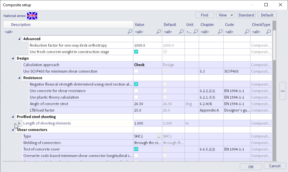 | Length of sheeting elements | default value for the length of sheeting construction elements; this setting is taken into account in the LTB steel code check for the stabilizing influence of the profiled steel sheeting on the steel beams |