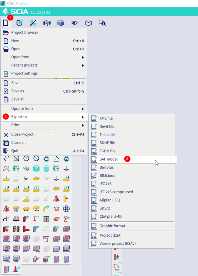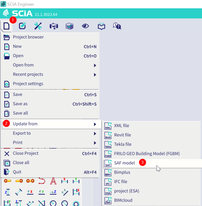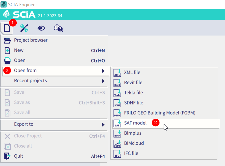 For import SAF file to SCIA Engineer click on the File, choose Open from and then select SAF model.