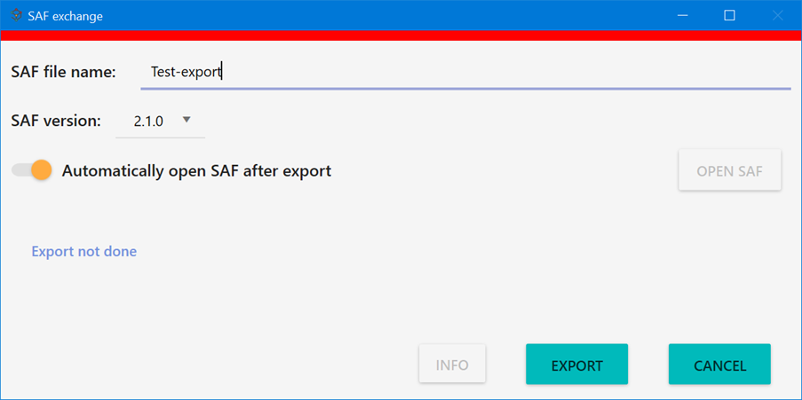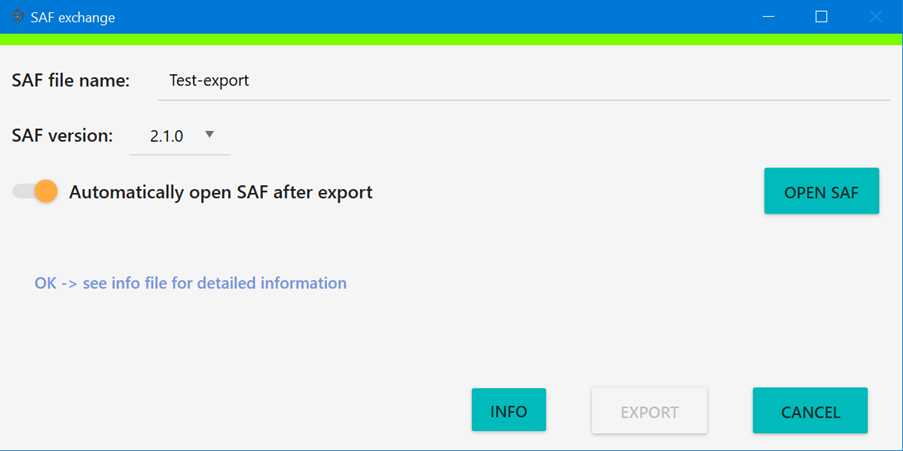 SAF Exchange dialog will open for you. Here you can change the name of the output file, set the specific SAF version and also choose, if you want to automatically open the output file after export.