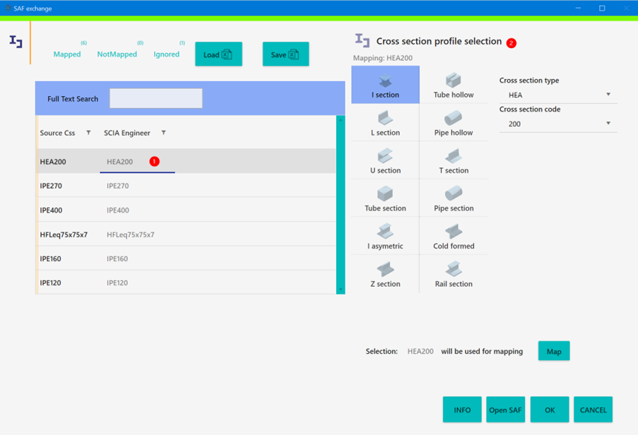 Standard Windows dialog with choosing your SAF file location pops-up. After you chose it, mapping table window will be shown to you. Here you will see list of cross-sections. System will try to map them automatically to SCIA library. If auto-map can’t find it or you want to change the mapping, just select the row with cross-section and map it by yourself in the right side of the window.
