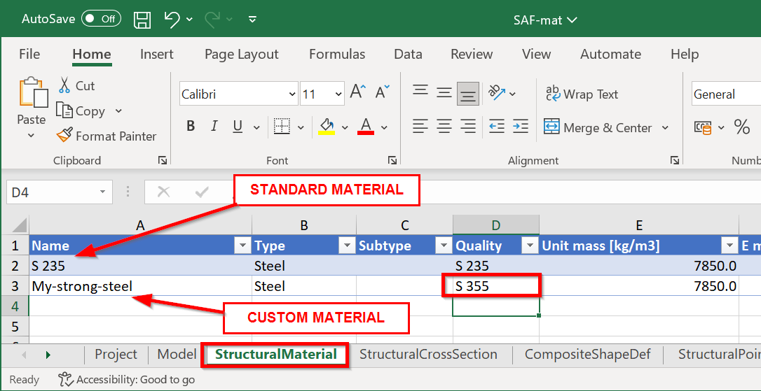 When you export materials from SCIA Engineer to SAF, the properties "name" and "quality" in the exported SAF file are filled with name of the material from SCIA Engineer. If you are using manually created material in SCIA Engineer with some custom name and you still want to set some different value to property "quality" in SAF, you can name material in SCIA Engineer using following format: NAME {QUALITY}.