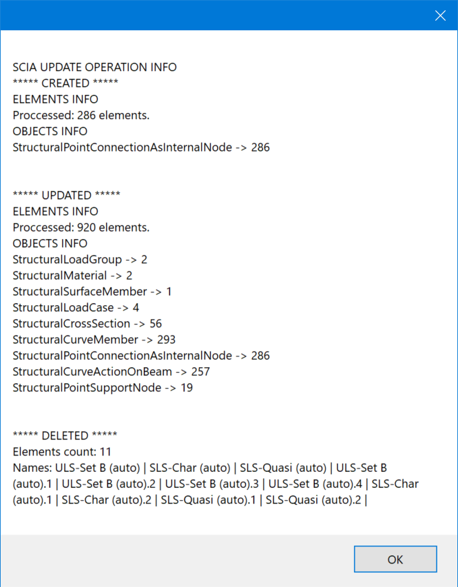 You confirm this step by OK button and the model will be updated. At the end of the process info dialog will pop-up, where you can see, which objects were created, updated or deleted.