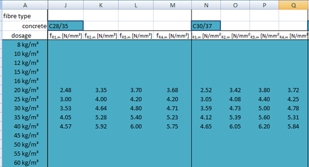 The calculation of material characteristics is based on the document see[1] DAfStb Guideline "Steel fibre reinforced concrete".The calculation of characteristic values is dependent on fibre type and dosage. Each concrete class has recommended fibre types and dosages. Based on that the residual strengths values fR1,m to fR4,m are determined. These strengths are input for other calculation. Nevertheless the characteristic values will be presented in the material library as the first values for user (ffct0,L1; ffct0,L2; ffct0,u; ffct0,s). The input for calculation is list of measured values from the tests. This list is available for specific concrete class, fibre type and dosage (see the example below).