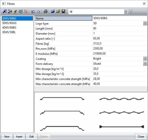 The fibre type is then possibly selected in material of steel fibre concrete directly. The material characteristics are calculated based on the selected fibre type.