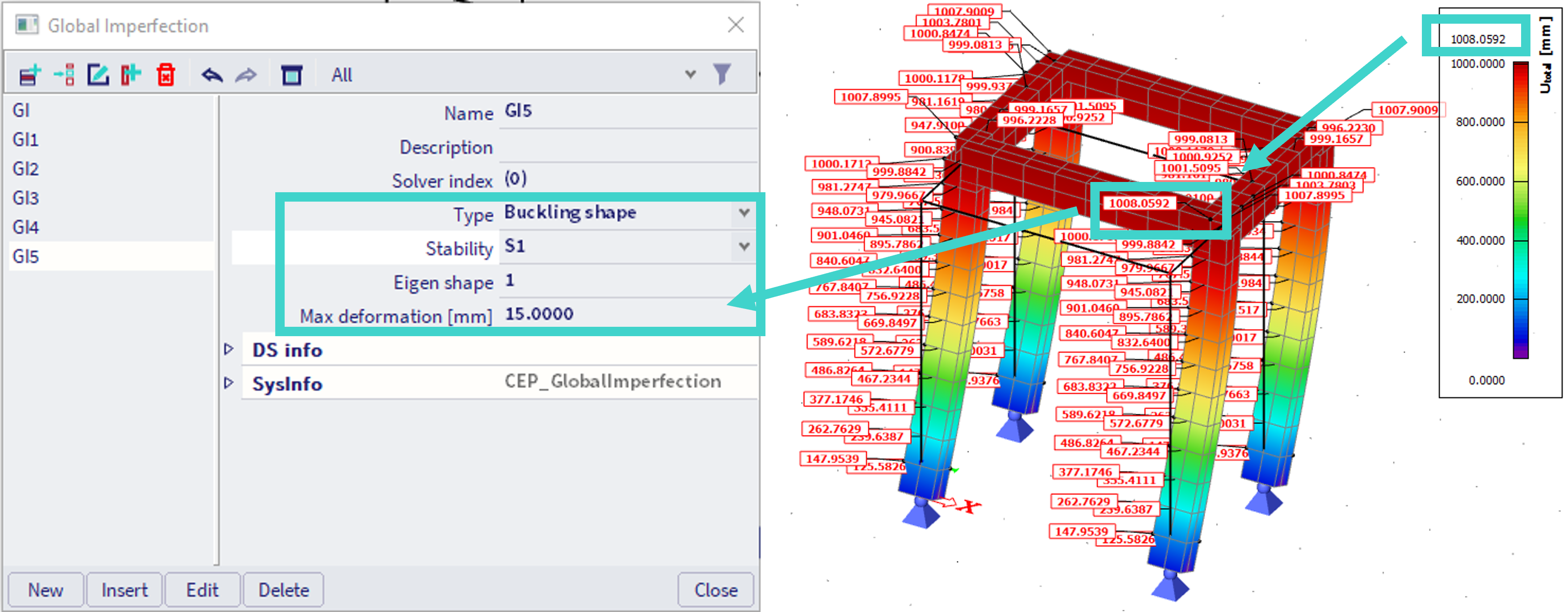 Based on selected stability combination and Eigen shape of this combination (in example above S1 and the 1st Eigenshape), the initial geometrical imperfection will be defined. Maximal deformation (in provided example 15 mm) will be considered in the point of the maximal normalized result from the linear stability analysis (in example above circa 1008 mm).