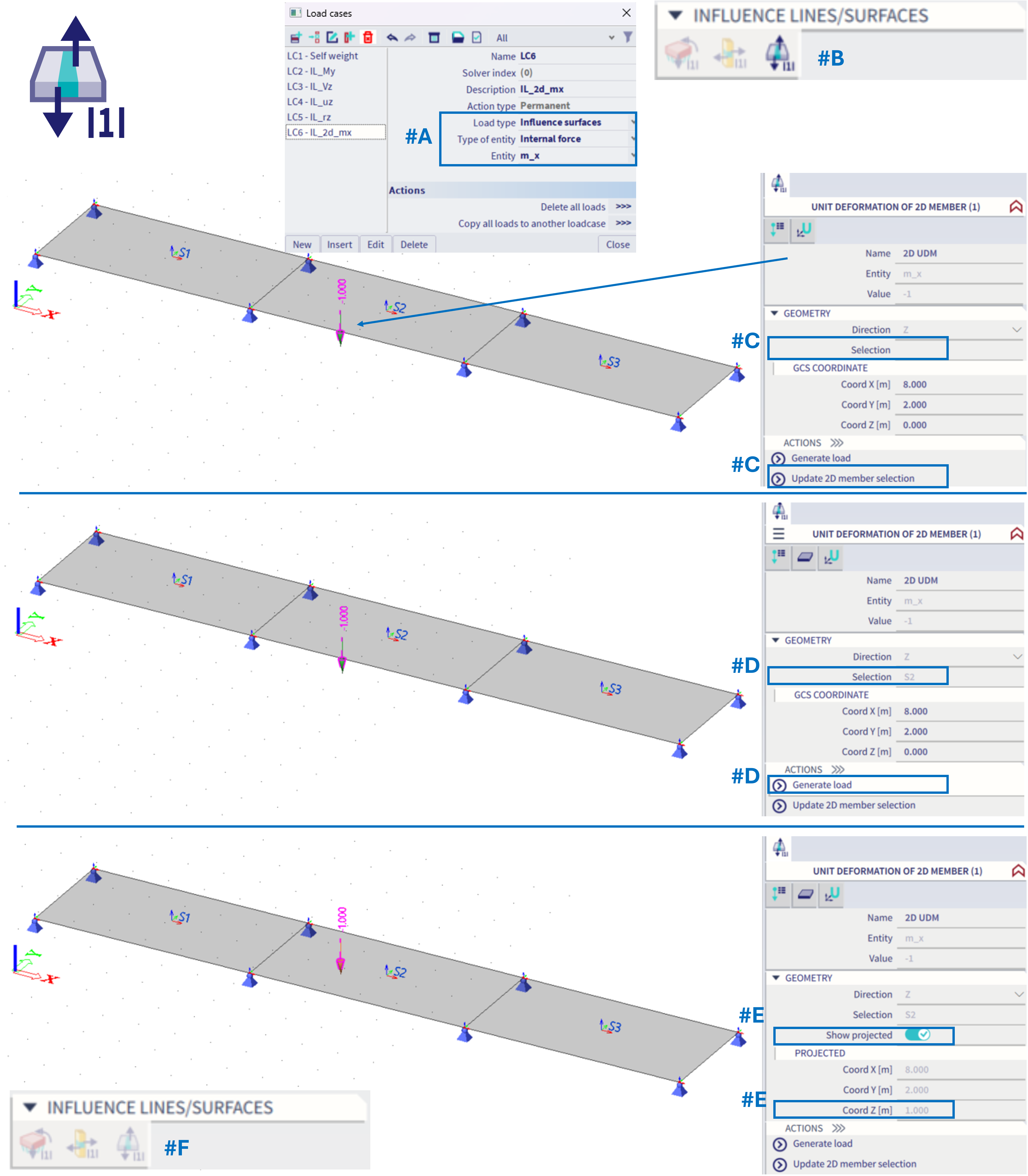 #F = Once the unit load is defined (not necessarily projected), it is not possible to define additional one within the same load case, as ONLY one might be defined. If the unit load within this load case is deleted, it might be defined elsewhere in space and projected on a different 2D member.