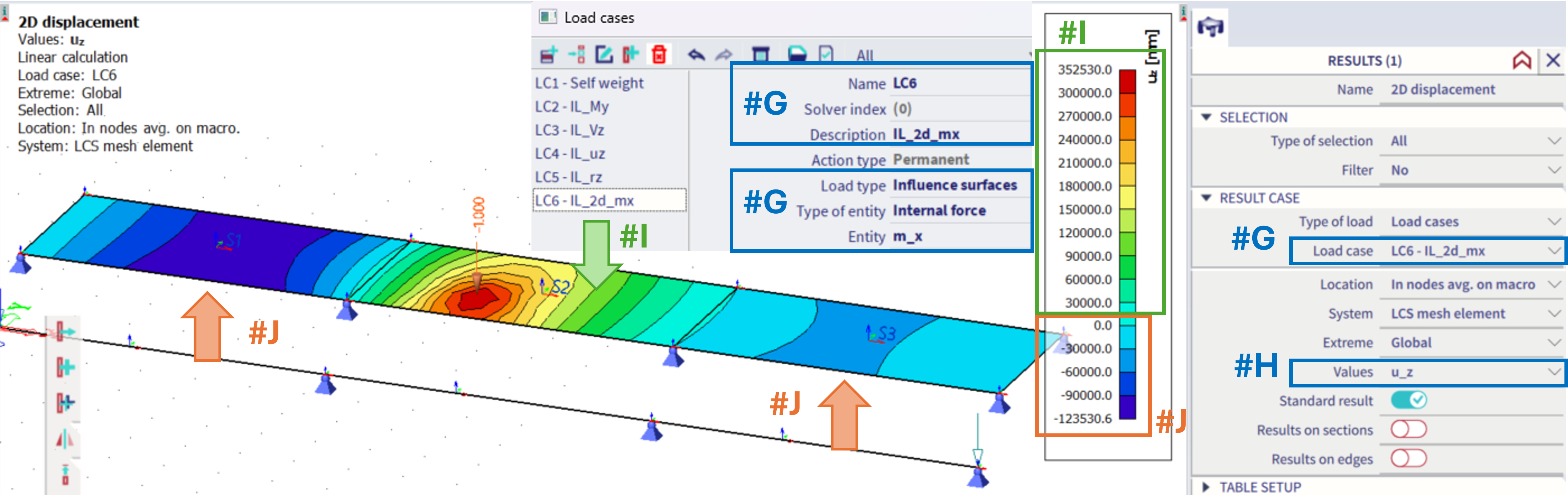 For the example of the m_x moment at the given position #G(In the second, middle slab of the structure), in order to see the influence surface, the results of u_z (#H) of this corresponding load case need to be plotted.