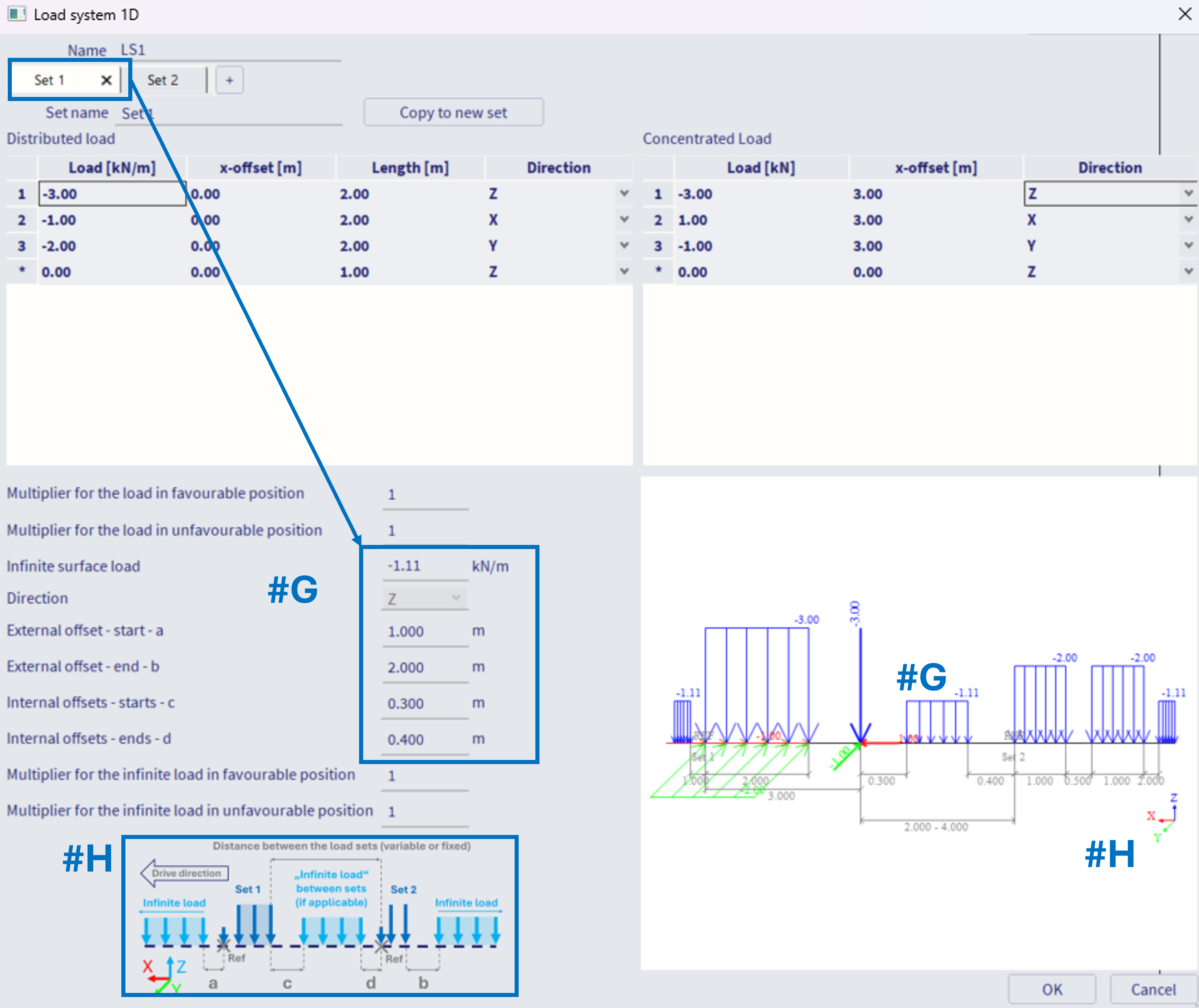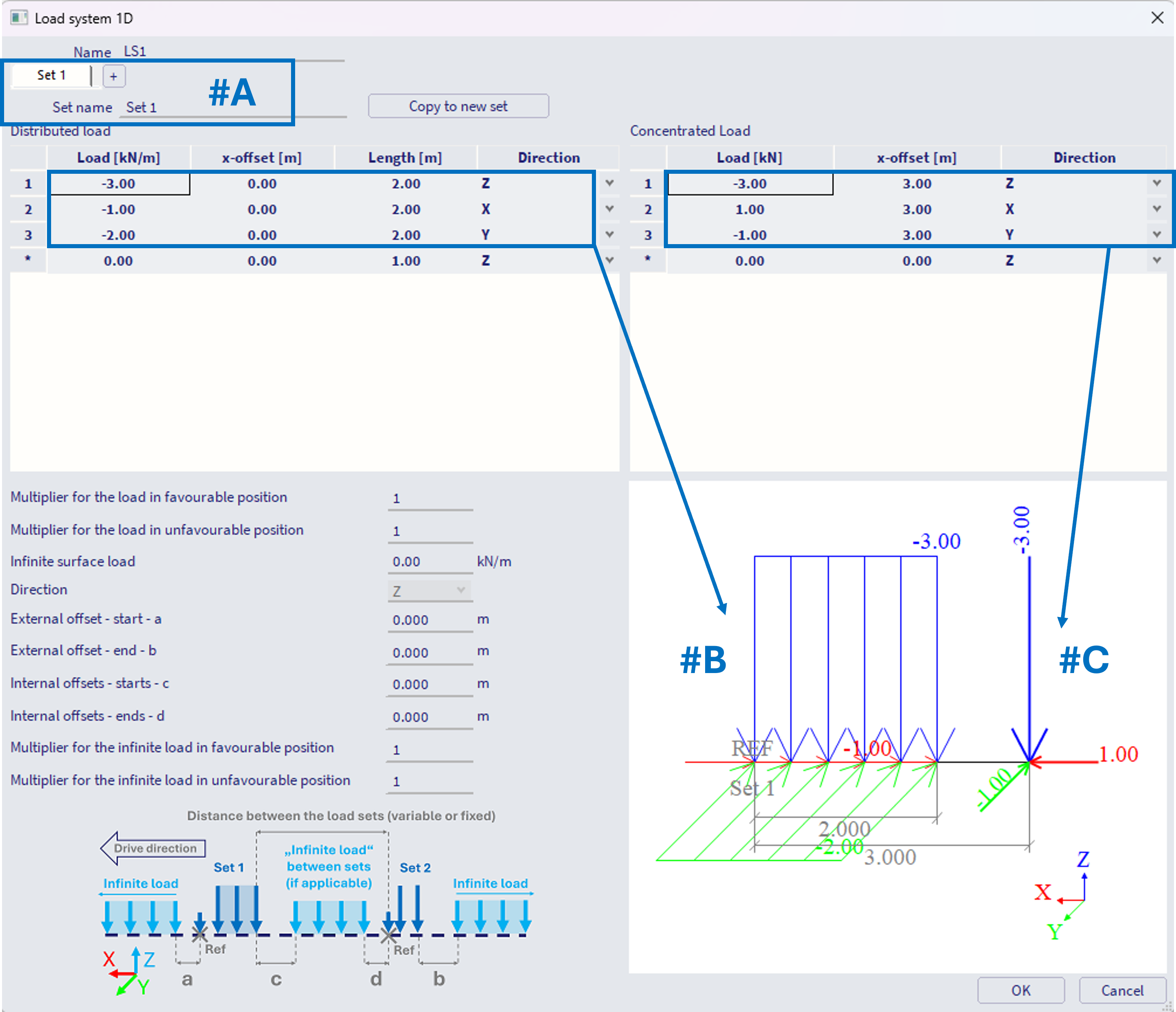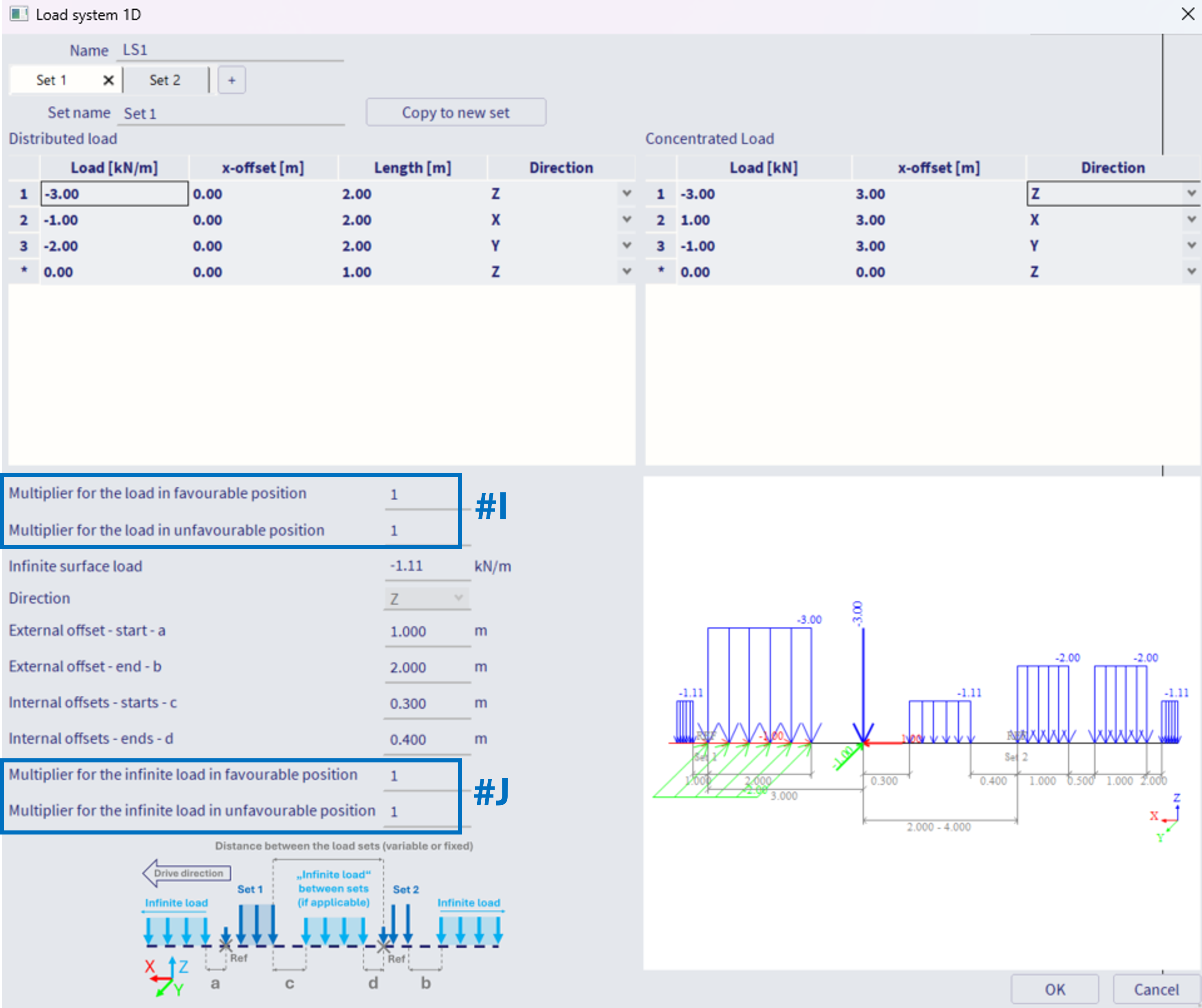 2) imagine the "sets" as vehicles moving in one lane. The axis of such lane is the "load system 1D", consisting of these sets. In order to consider several parallel lanes on one beam, or for example a crane which loads two parallel beams further away from each other (two distinct1D Traffic lanes) - this needs to be handled by either several load systems, or perhaps one load system assigned to several traffic lanes. This procedure is handled in subsequent step of the work flow, in Moving loads generator 1D. Examples are provided in this chapter.