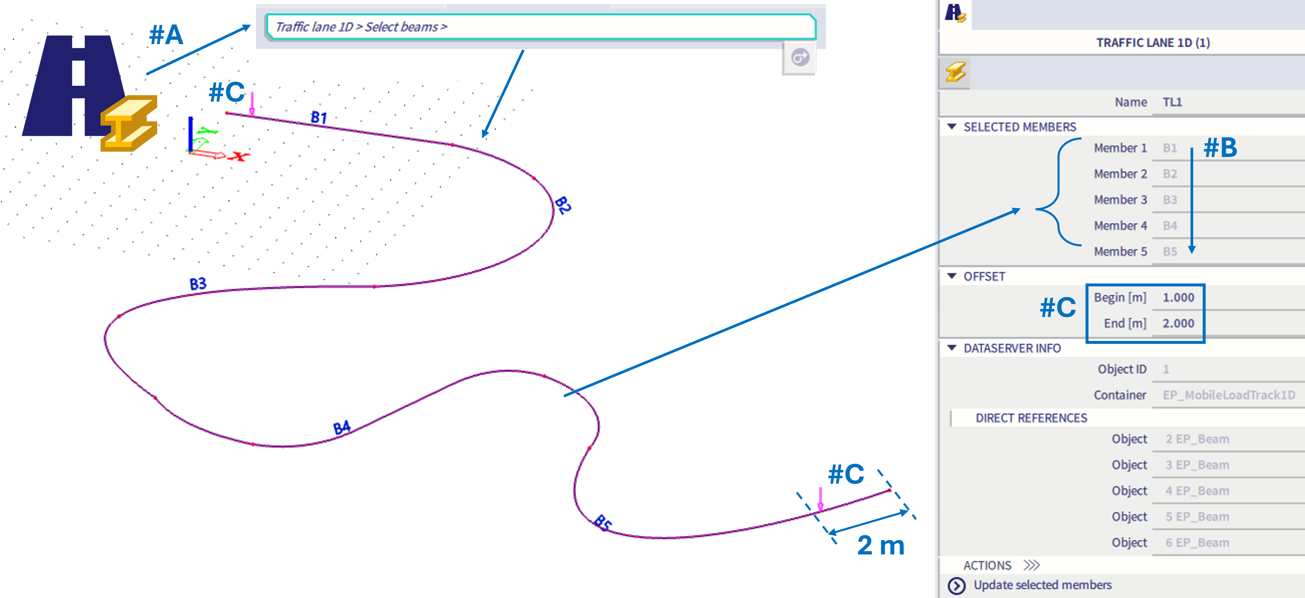 #A - upon triggering the command "traffic lane 1D" - a selection of 1D beams is required. The traffic lane 1D is directly bounded with specific 1D members, and is defined by their geometry. In general, any kinds of beams (straight, circular, etc.) might be selected.